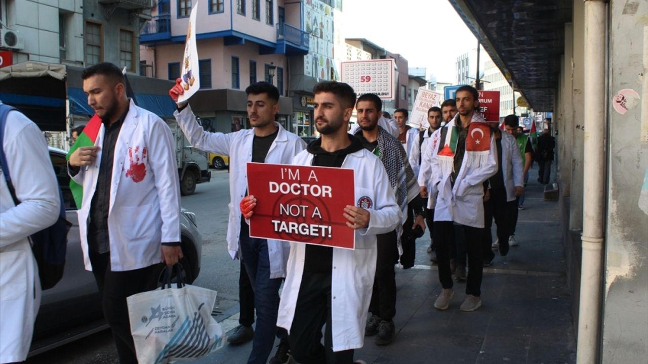 Mersin Üniversitesi Tıp Fakültesi öğrencisi Melih Hilmi Tekin, konuşmasında, İsrail'in insan hakları ve uluslararası hukuk kurallarını ihlal ettiğini belirterek, "Hekim ve sağlık çalışanları olarak İsrail'in saldırılarına tepki göstermeye, Gazze'deki çocukların, kadınların, hastaların ve meslektaşlarımızın hayatlarının korunması adına mesleğimize yakışır duruş ortaya koymaya kararlıyız." dedi.
