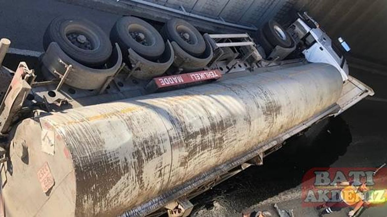 Rıdvan Karabük idaresindeki 33 DFC 69 plakalı sıvı asfalt yüklü tır, Adana-Ankara otoyolu Pozantı güney giriş tünelinde henüz belirlenemeyen neden devrildi.