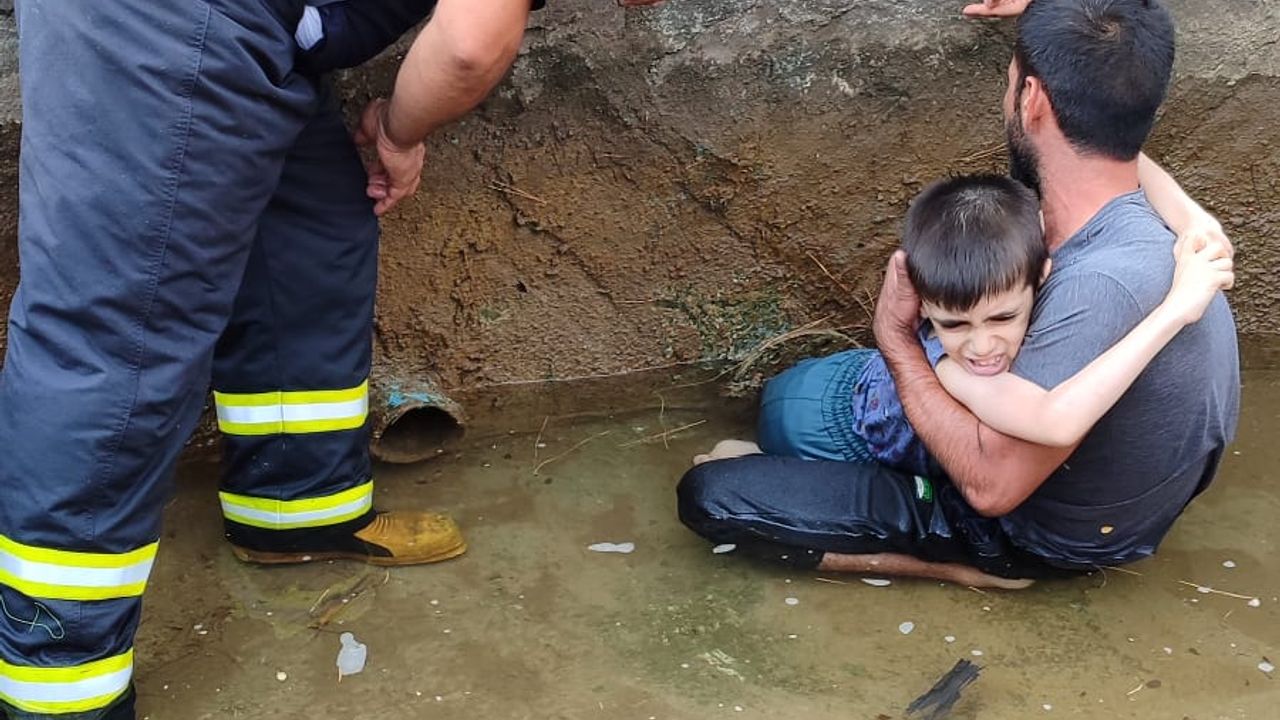Havuzun su seviyesini düşüren itfaiye ekibi, çocuğun ayağını sıkıştığı yerden çıkardı.