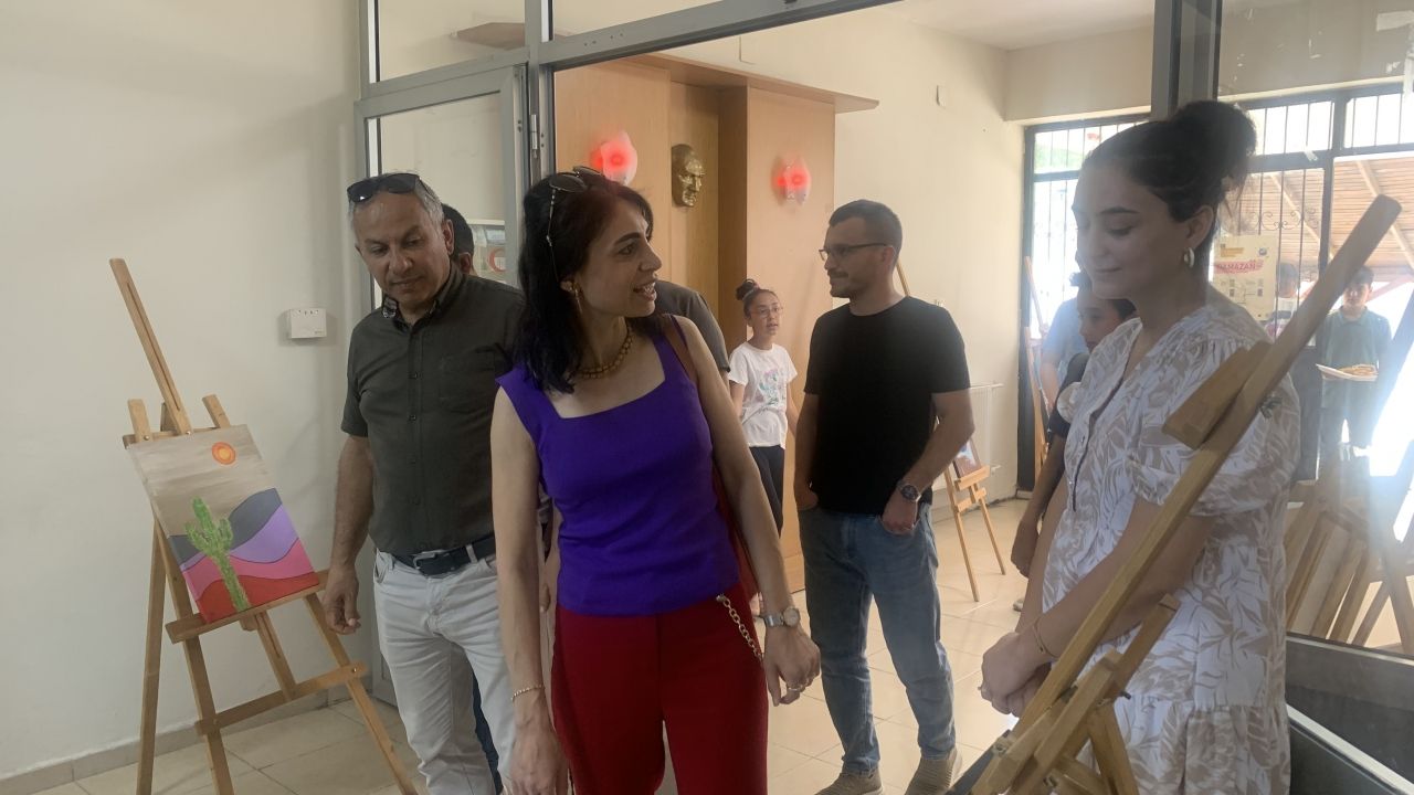Okulda açılan sergiyi gezen katılımcılar resimler hakkında bilgi aldı.