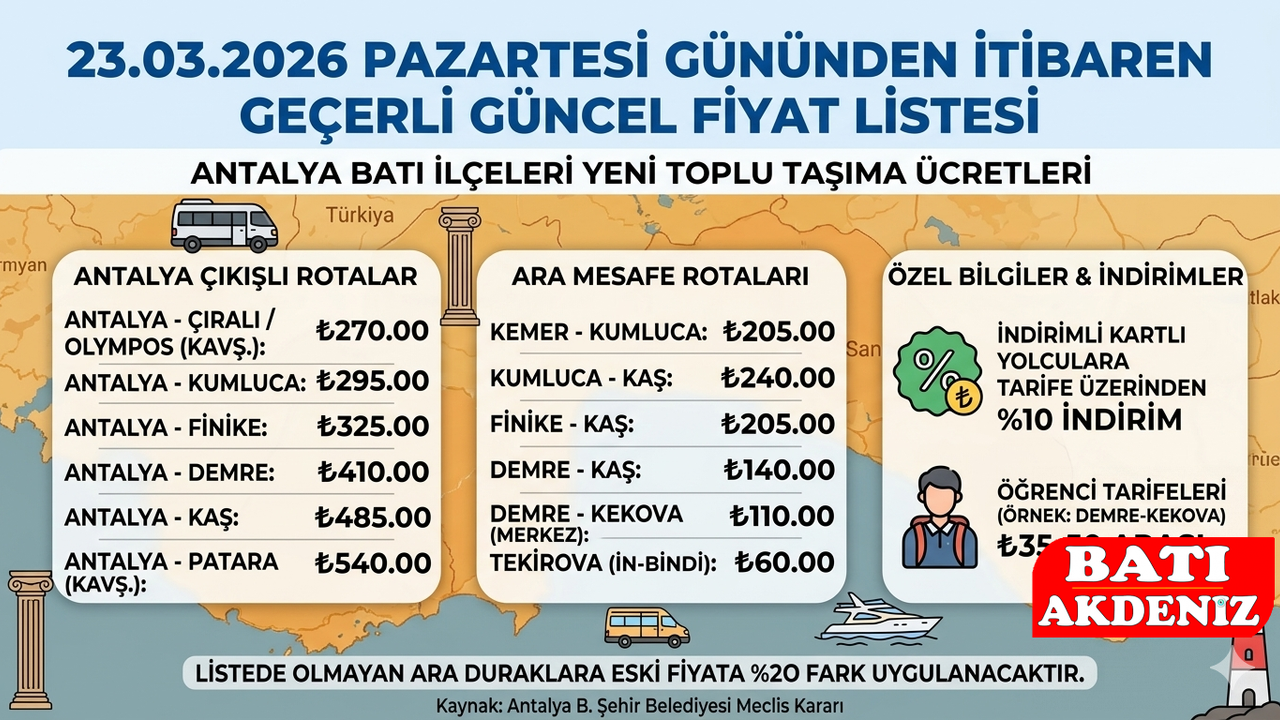 Antalya Büyükşehir Belediyesi'nin 09.03.2026 tarihli meclis kararına istinaden, şehrin batı aksındaki toplu taşıma ücretlerinde değişikliğe gidildi. Yarından itibaren uygulanmaya başlanacak olan Ücret Listesi kapsamında ilçeler arası ulaşım maliyetleri yeniden şekillendi.