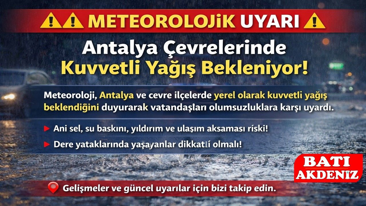 Meteoroloji Genel Müdürlüğü tarafından yapılan son değerlendirmelere göre, Antalya genelinde ve çevre ilçelerde kuvvetli sağanak yağış bekleniyor. Yağışlarla birlikte ani sel, su baskını, yıldırım, dolu ve ulaşımda aksamalar gibi risklere karşı dikkatli olunması istendi. Yetkililer, özellikle dere yatakları ve riskli bölgelerde yaşayan vatandaşların tedbirli davranması çağrısında bulundu.