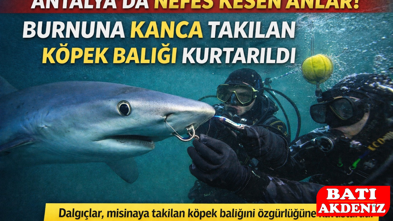 ANTALYA’da Sıçan Adası açıklarında su altı hatlarında bakım ve kontrol çalışması yürüten sanayi dalgıçları, balıkçılık ekipmanına takılarak hareket etmekte zorlanan bir camgöz köpek balığını kurtardı.