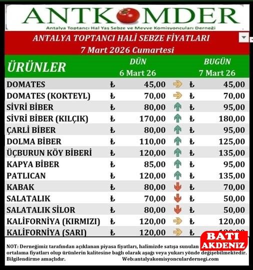 Antalya Toptancı Hali’nde 7 Mart 2026 Cumartesi günü açıklanan piyasa fiyatlarına göre sebze grubunda önemli değişimler yaşandı. Domates ve kokteyl domates fiyatları sabit kalırken, birçok biber çeşidi ile patlıcanda yükseliş görüldü.