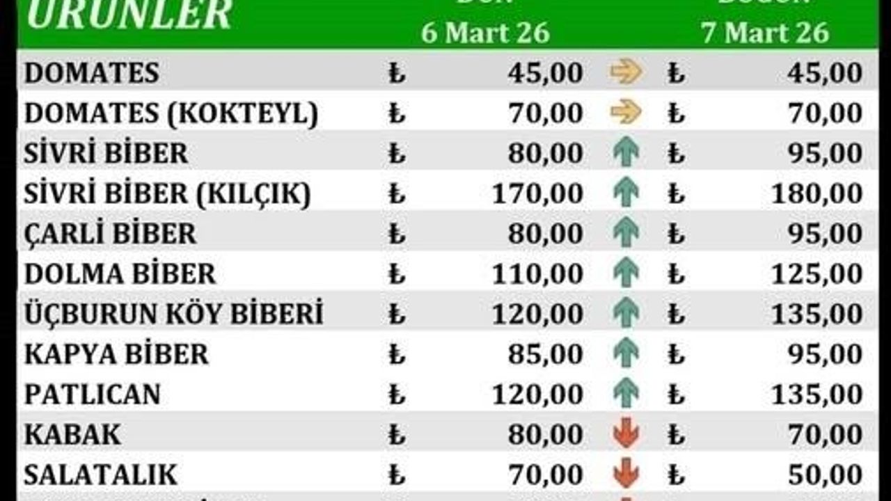 Hal verilerine göre sivri biber 95 TL, kılçık sivri biber 180 TL, çarli biber 95 TL ve dolmalık biber 125 TL seviyesine yükseldi. Üçburun köy biberi 135 TL, kapya biber ise 95 TL olarak kaydedildi. Patlıcan fiyatı da 135 TL’ye çıkarak artış gösteren ürünler arasında yer aldı.