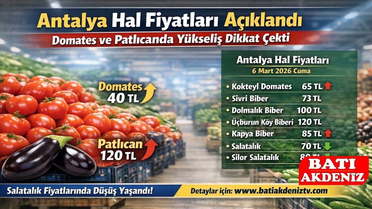 Antalya Toptancı Hali’nde 6 Mart 2026 Cuma günü itibarıyla sebze fiyatları üretim miktarı ve piyasa talebine bağlı olarak güncellendi. Açıklanan verilere göre domates ve patlıcan fiyatlarında artış dikkat çekerken, salatalık fiyatlarında ise düşüş yaşandı.