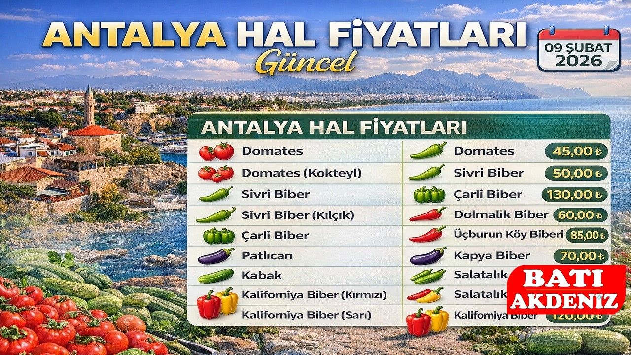 Antalya hal piyasasında 09 Şubat 2026 tarihli fiyat listesi açıklandı. Açıklanan verilere göre domates ve kokteyl domates grubunda daha dengeli bir seyir gözlenirken, kılçık sivri biber ve sarı Kaliforniya biber gibi ürünler yüksek fiyatlarıyla öne çıktı.