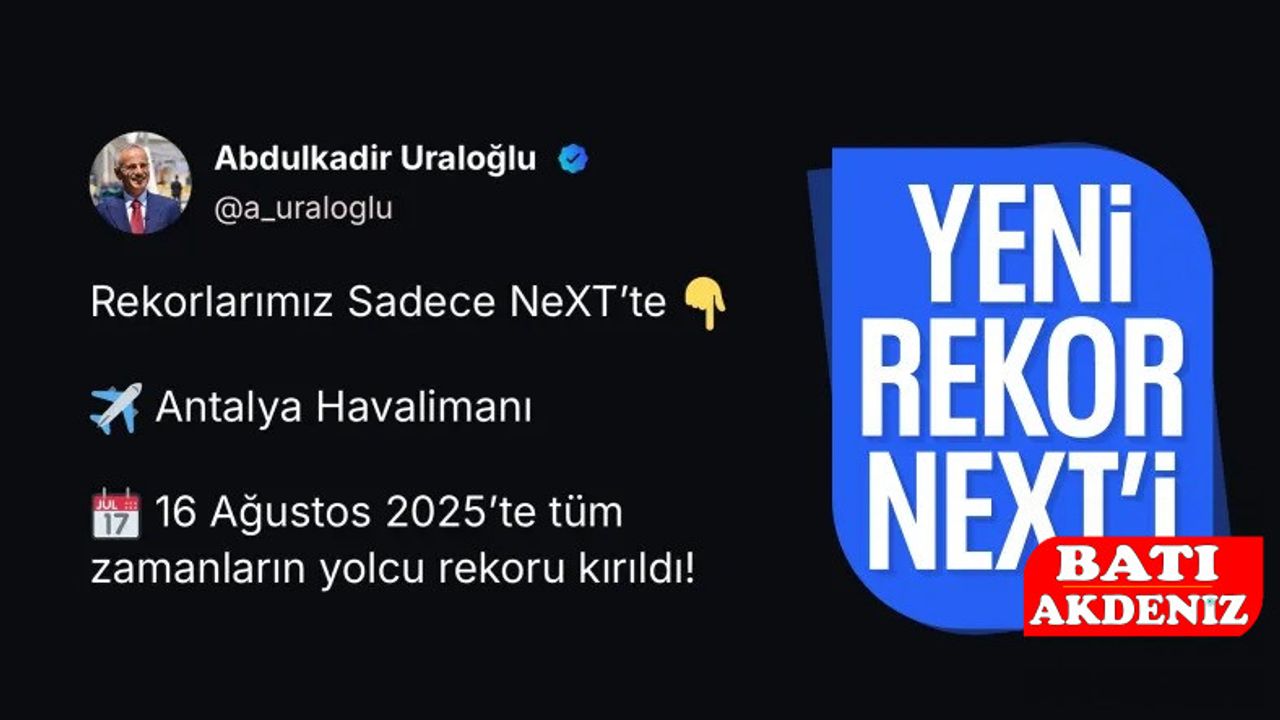 Ulaştırma ve Altyapı Bakanı Abdulkadir Uraloğlu, yerli sosyal medya platformu NeXT üzerinden yaptığı açıklamada Antalya Havalimanı’nda tarihi bir rekora imza atıldığını duyurdu. Bakan Uraloğlu’nun paylaşımına göre 16 Ağustos 2025 tarihinde havalimanından sadece 24 saat içinde 230 bin 2 yolcu geçiş yaptı. Böylece geçtiğimiz yıl 3 Ağustos'ta kırılan 223 bin 217 kişilik günlük yolcu rekoru resmen geride bırakılmış oldu.