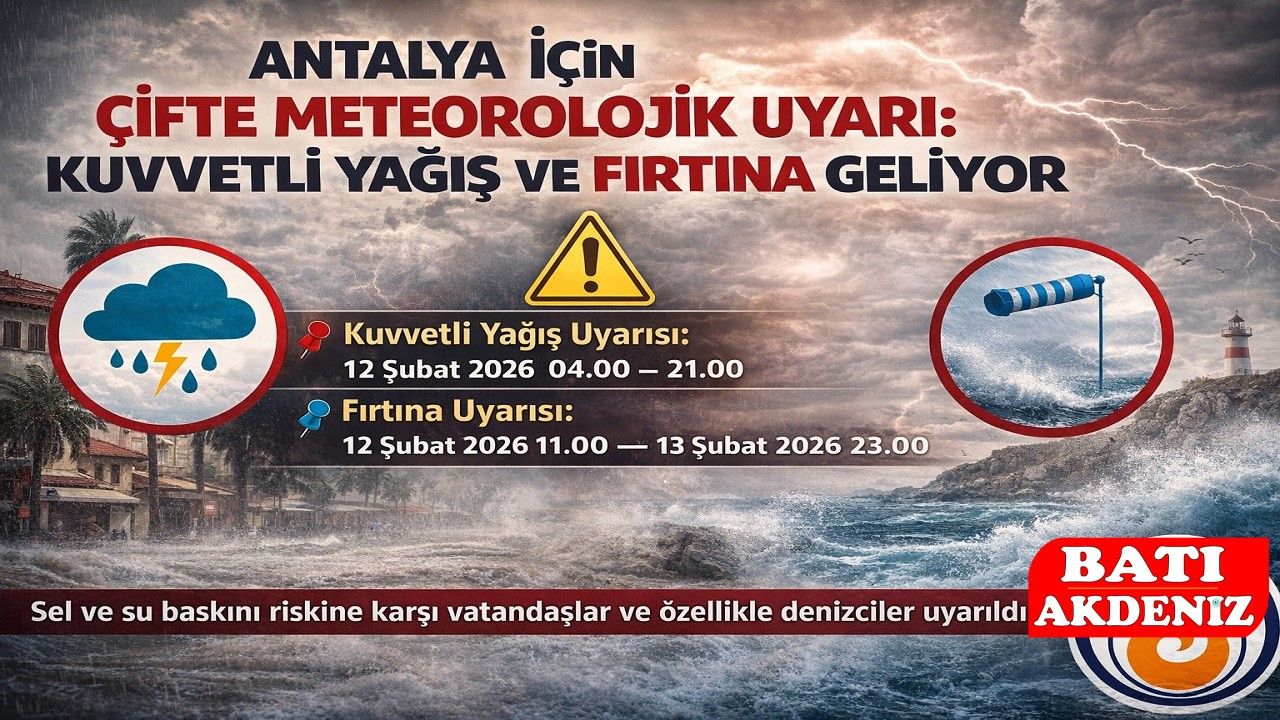 12 Şubat 2026 Perşembe günü saat 04.00’ten itibaren Antalya’nın batı ilçeleri Kaş, Demre, Finike, Kumluca, Kemer, Elmalı ile doğu ilçeleri Aksu, Serik, Manavgat, Alanya, Gazipaşa, İbradı, Akseki ve Gündoğmuş’ta kuvvetli ve yer yer çok kuvvetli sağanak yağış (25-75 kg/m²) bekleniyor.