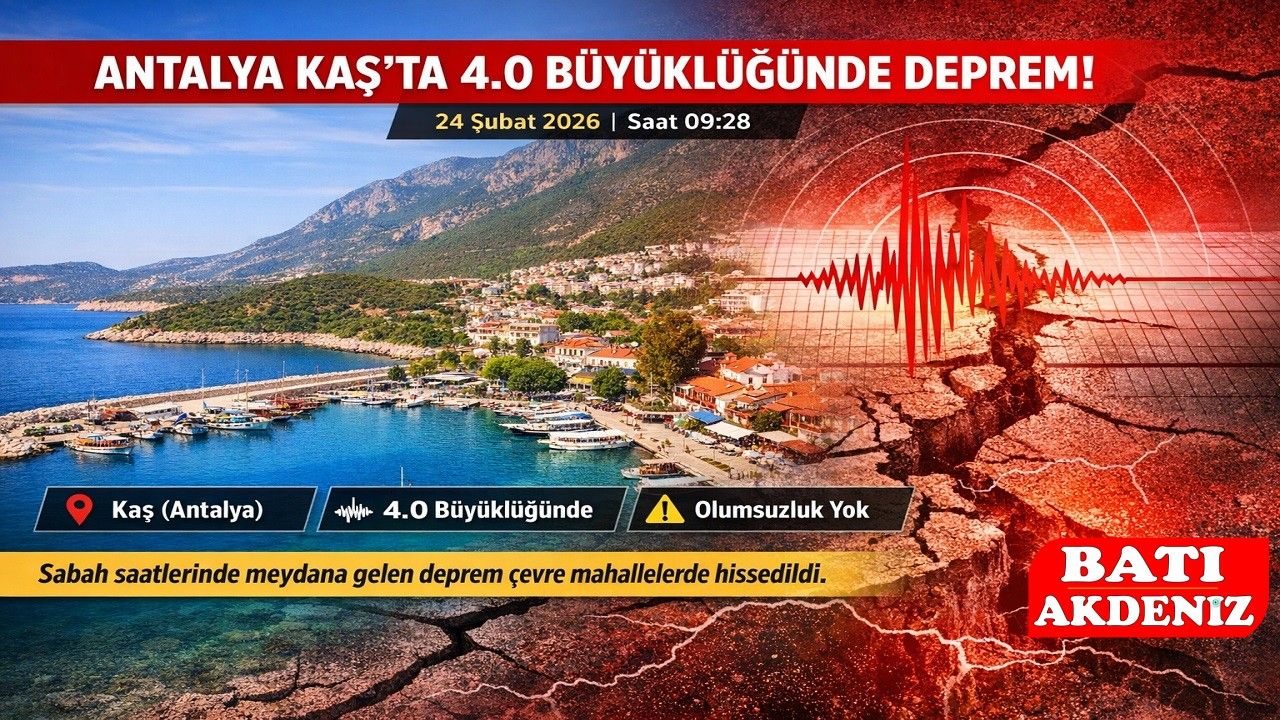 24 Şubat 2026 saat 09:28’de Antalya’nın Kaş ilçesinde 4.0 büyüklüğünde deprem meydana geldi. Sabah saatlerinde yaşanan sarsıntı kısa süreli paniğe neden olurken, ilk belirlemelere göre olumsuz bir ihbar yapılmadı.