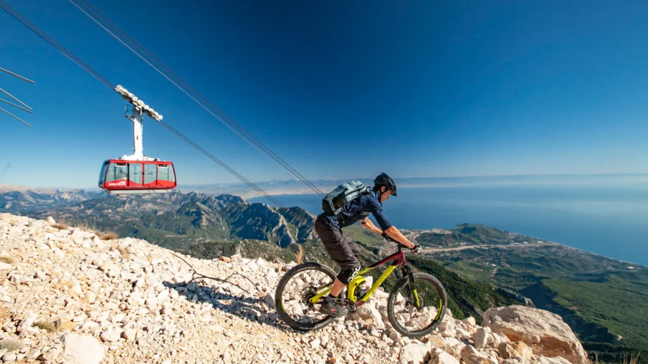 2 bin 365 m yüksekliğe teleferikle çıktıktan sonra plaja ulaşacak sporcular, yarışı bisikletleri ile denize atlayarak noktalayacaklar.