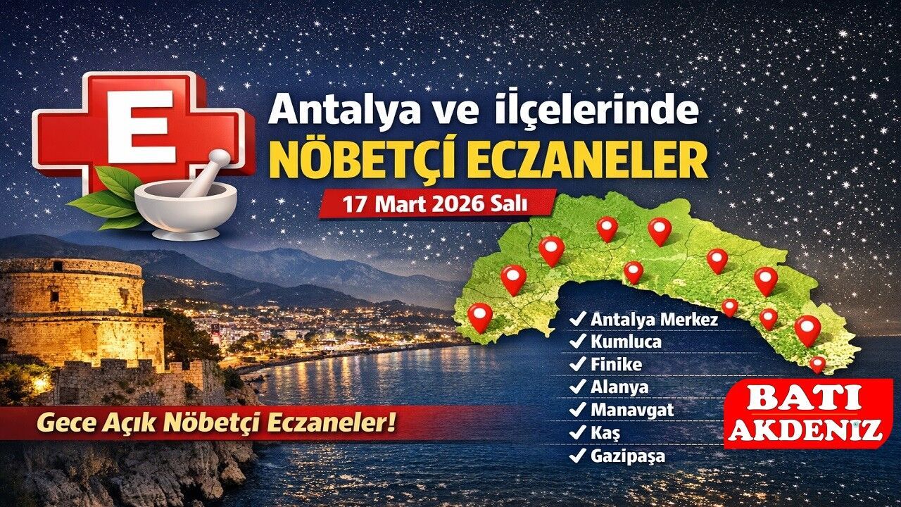 Antalya genelinde vatandaşların acil ilaç ihtiyaçlarını karşılayabilmesi için 17 Mart 2026 Salı günü nöbetçi olan eczaneler açıklandı. Antalya merkez başta olmak üzere Kumluca, Finike, Serik, Alanya, Manavgat, Kaş, Demre, Gazipaşa ve diğer ilçelerde nöbetçi eczaneler gece boyunca hizmet verecek.