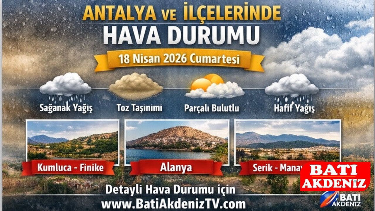 Antalya ve ilçelerinde hava durumu 18 nisan 2026 Cumartesi www.BatiAkdenizTv.com için konu ile ilgili seoya uygun başlık yaz + spot metni oluştur + www.BatiAkdenizTv.com için Detaylı haber metni oluştur + anahtar kelimeler kod olarak + www.BatiAkdenizTv.com site içi SEO linkli anahtar kelime kodu hazırla