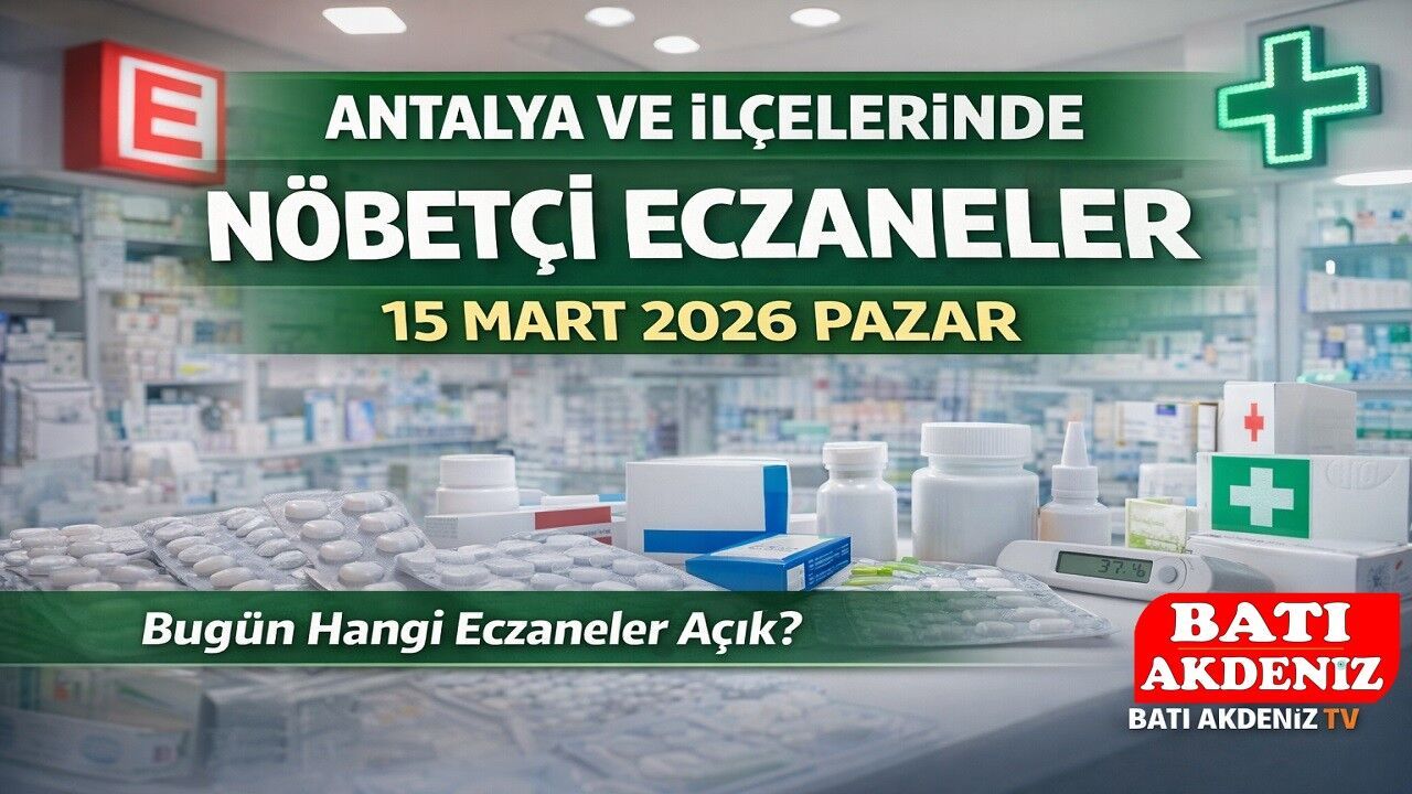 Antalya’da 15 Mart 2026 Pazar günü nöbetçi olarak görev yapacak eczaneler açıklandı. Antalya merkez başta olmak üzere Kumluca, Finike, Serik, Alanya, Manavgat ve diğer ilçelerde vatandaşların acil ilaç ihtiyaçlarını karşılayabilmesi için belirlenen eczaneler gece boyunca hizmet vermeye devam edecek.
