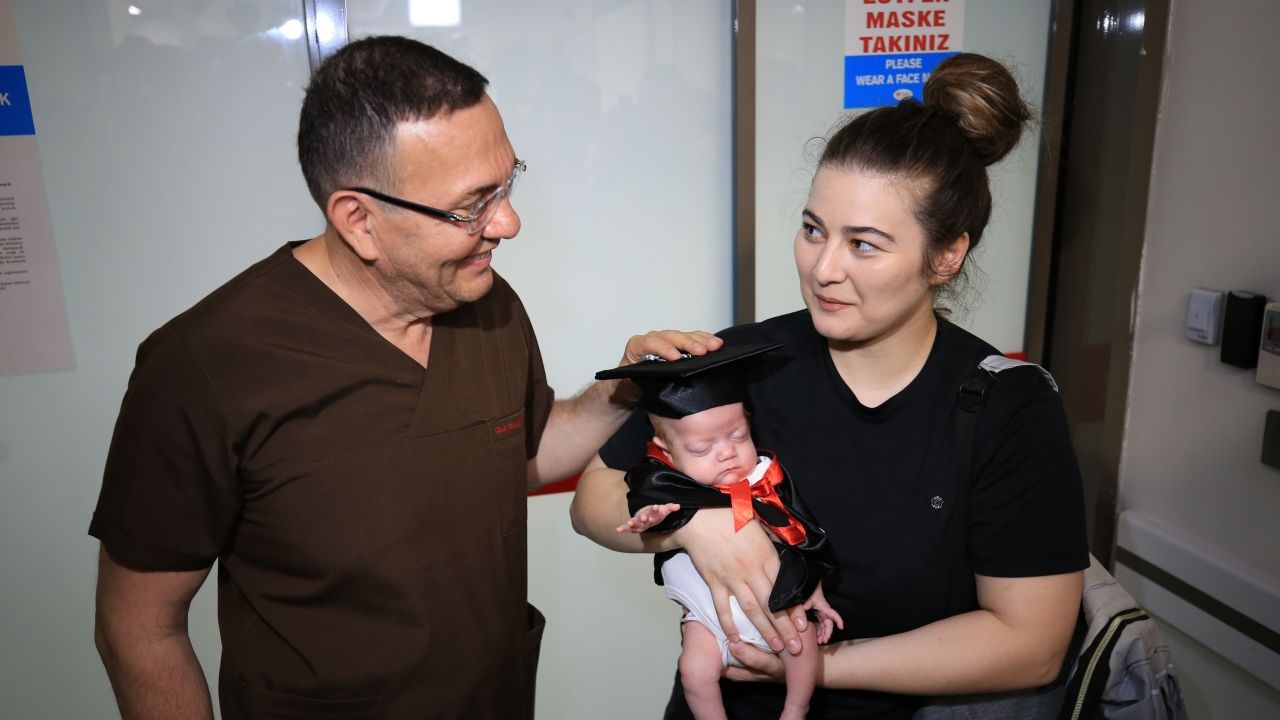 "Mercan Çınar" adı verilen bebek, hastanenin yoğun bakımdan çıkan bebeklere yönelik uygulaması kapsamında, mezuniyet cübbesi ve kep giydirilerek taburcu edildi.