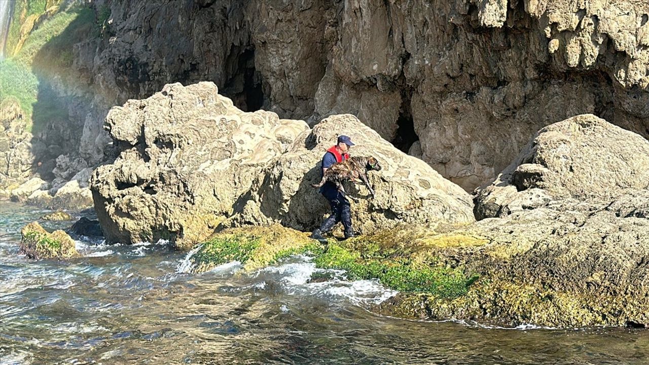 Çağlayan Mahallesi’ndeki Düden Şelalesi'nin denize döküldüğü bölgede yürüyüş yapanlar, falezlerden köpeğin denize düştüğünü fark etti.