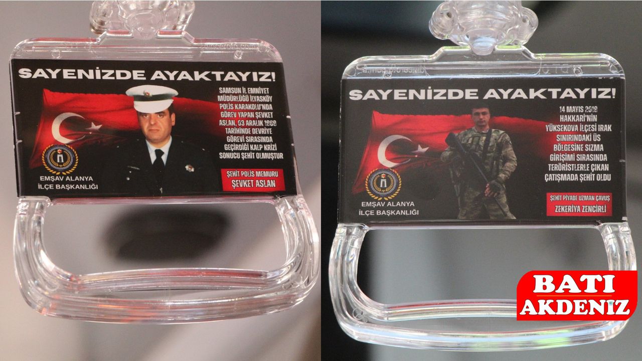 Antalya’nın Alanya ilçesinde, halk otobüslerine yolcuların tuttuğu askı yerlerine, şehit güvenlik görevlilerinin isimleri ile fotoğraflarının yer aldığı özel kartlar yerleştirildi.