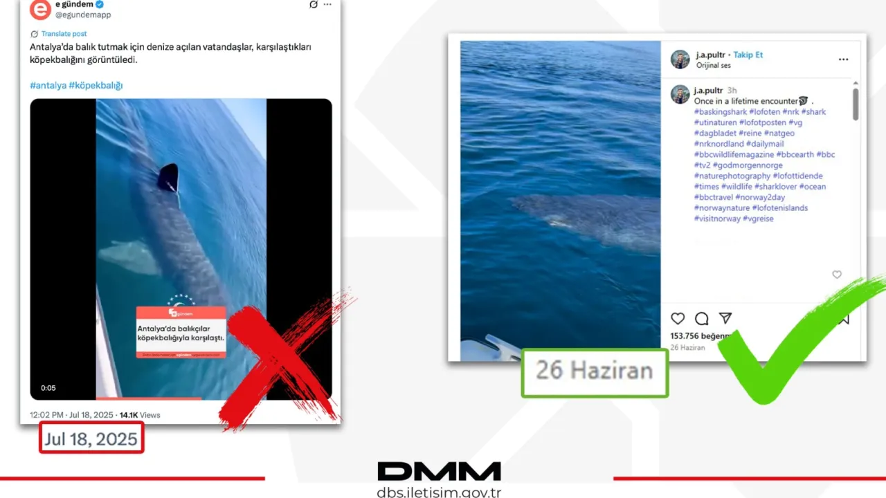 ANTALYA (İGFA) - İletişim Başkanlığı Dezenformasyonla Mücadele Merkezi (DMM), sosyal medyada Antalya sahillerinde köpekbalığı görüldüğü iddiasıyla paylaşılan bir videonun dezenformasyon olduğunu duyurdu.