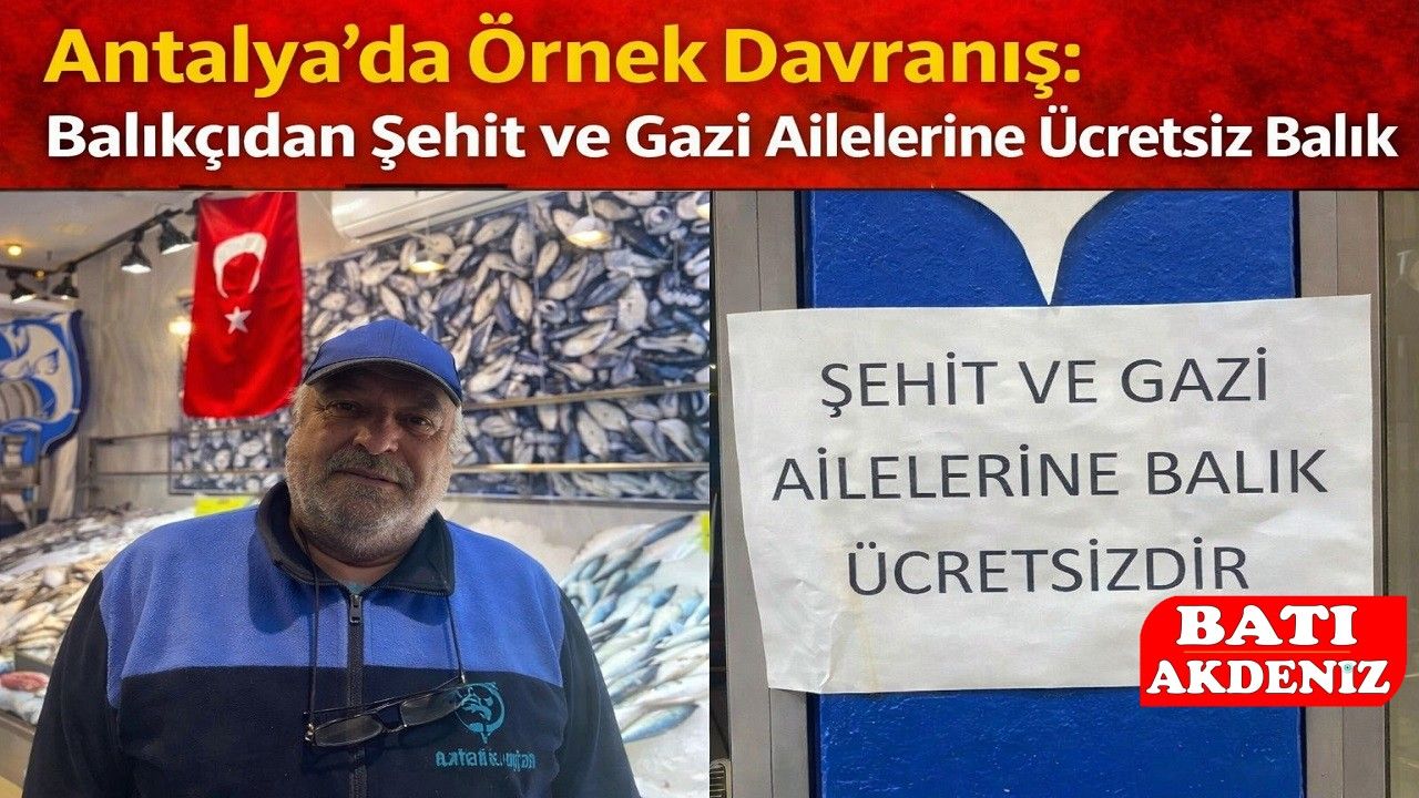 Antalya’da bir balıkçı esnafı, sergilediği duyarlı davranışla vatandaşların takdirini kazandı. İşletmesinin camına astığı “Şehit ve gazi ailelerine balık ücretsizdir” yazısıyla dikkat çeken esnaf, şehit ve gazi yakınlarından balık ücreti almıyor.