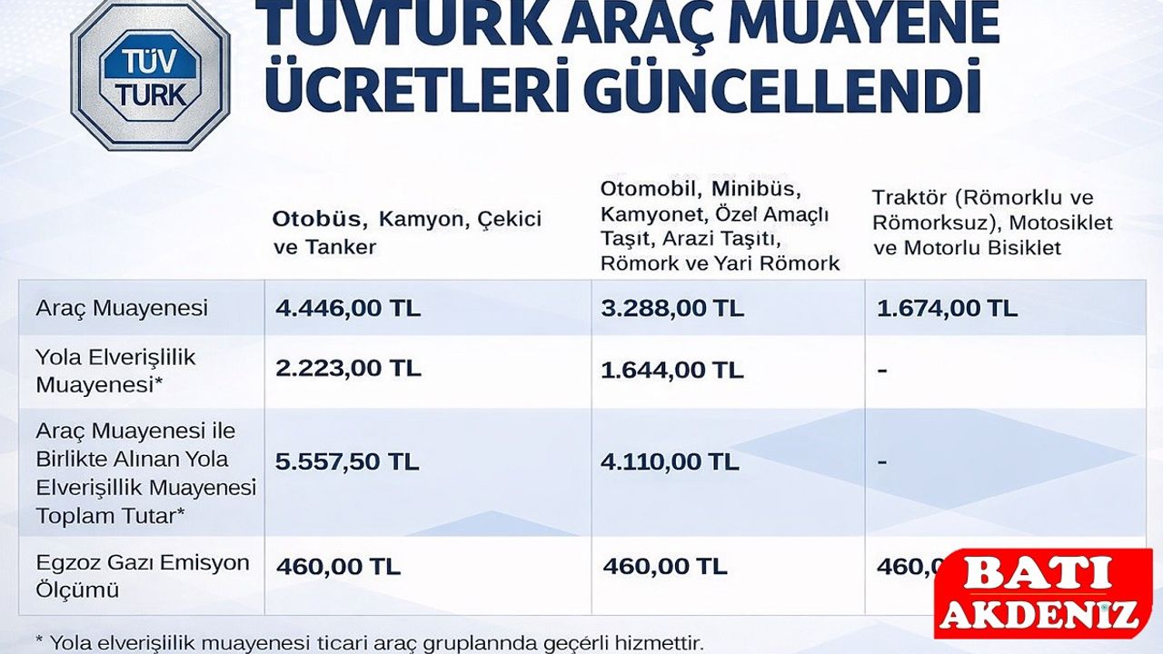 TÜVTÜRK, araç muayene istasyonlarında uygulanacak güncel fiyat listesini kamuoyuyla paylaştı. Açıklanan tarifeye göre otomobil, minibüs, kamyon, çekici, traktör ve motosiklet gibi farklı araç gruplarında muayene ve yola elverişlilik ücretleri yeniden belirlendi.