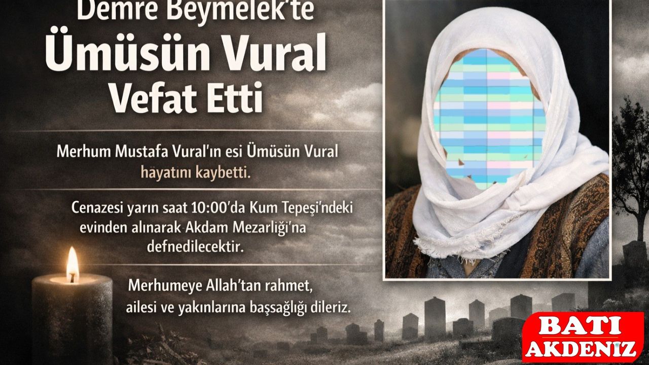 Antalya’nın Demre ilçesi Beymelek Mahallesi Kum Tepesi mevkinden, merhum Mustafa Vural’ın eşi Ümüsün Vural hayatını kaybetti.