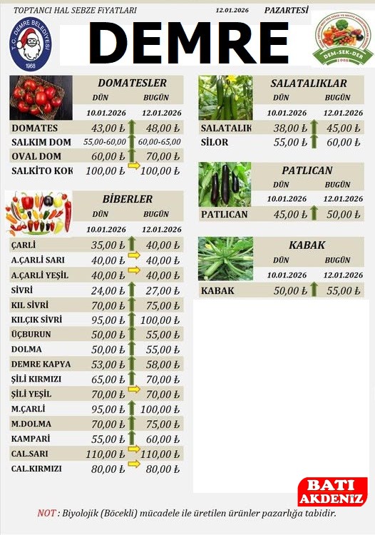 Antalya’nın önemli tarım merkezlerinden biri olan Demre’de toptancı hal fiyatları güncellendi. Günlük olarak belirlenen sebze ve meyve fiyatları, üreticiler, komisyoncular ve pazarcılar tarafından yakından takip ediliyor.