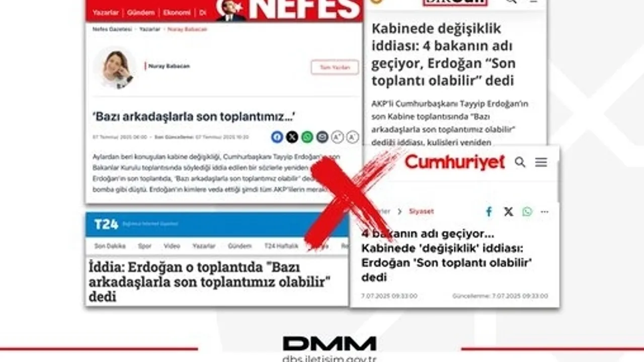 ANKARA (İGFA) -“Dezenformasyonla Mücadele Merkezi, bazı basın organları ve sosyal medyada yer alan, “Cumhurbaşkanı Recep Tayyip Erdoğan’ın son Kabine toplantısında ‘Bazı arkadaşlarla son toplantımız olabilir’ dediği” yönündeki iddiaların gerçeği yansıtmadığını duyurdu.