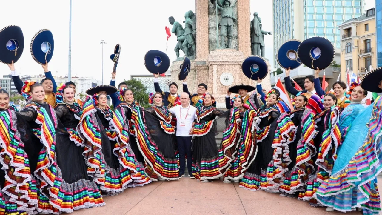 Uluslararası değerlendirme kuruluşları tarafından 9 kez üst üste “Dünyanın En İyi Kültür ve Sanat Festivali” seçilen, İstanbul Büyükşehir Belediyesi ile Büyükçekmece Belediyesi işbirliğiyle yapılan 25. Uluslararası İstanbul Büyükçekmece Kültür ve Sanat Festivali’nin çelenk takdimi Taksim Meydanı’nda gerçekleşti.İSTANBUL (İGFA) - 75 ülke temsilcisinin ülke bayraklarıyla katıldıkları çelenk takdim töreninde Meksika, Bulgaristan, Güney Kore ve Kazakistan’dan katılan dans ekipleri renkli ulusal folklorik kostümleri ve geleneksel müzikleri eşliğinde Taksim Meydanı’nda görsel bir şölen yaşattı.
