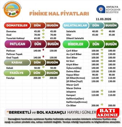 Antalya’nın Finike ilçesinde bulunan Finike Toptancı Hali’nde 11 Mart 2026 Çarşamba günü sebze fiyatları belli oldu. Türkiye’nin önemli sebze üretim merkezlerinden biri olan Finike’de günlük hal fiyatları üreticiler, tüccarlar ve pazarcılar tarafından yakından izleniyor.