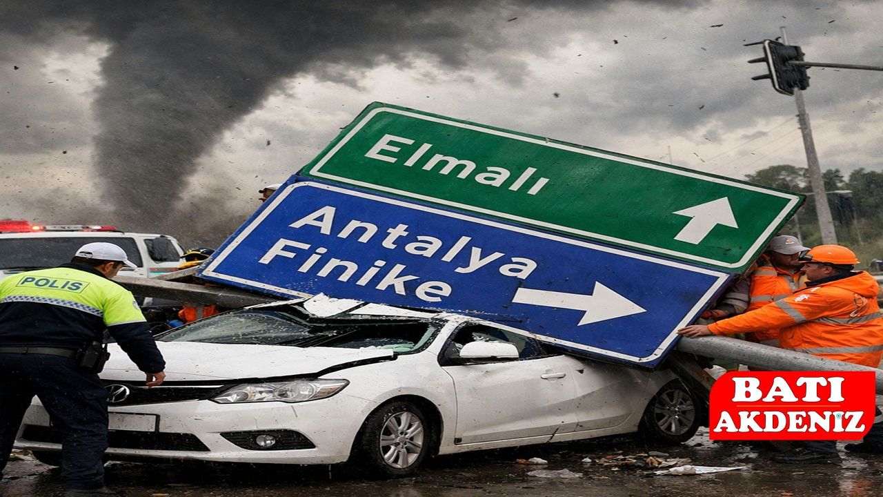 Antalya’nın Finike ilçesinde etkili olan hortum, Elmalı Yolu Kavşağı’nda tehlikeli anlara neden oldu. Karayolları Genel Müdürlüğü’ne ait yönlendirme tabelası, şiddetli rüzgârın etkisiyle yerinden koparak trafikte seyir halinde olan bir aracın üzerine devrildi.