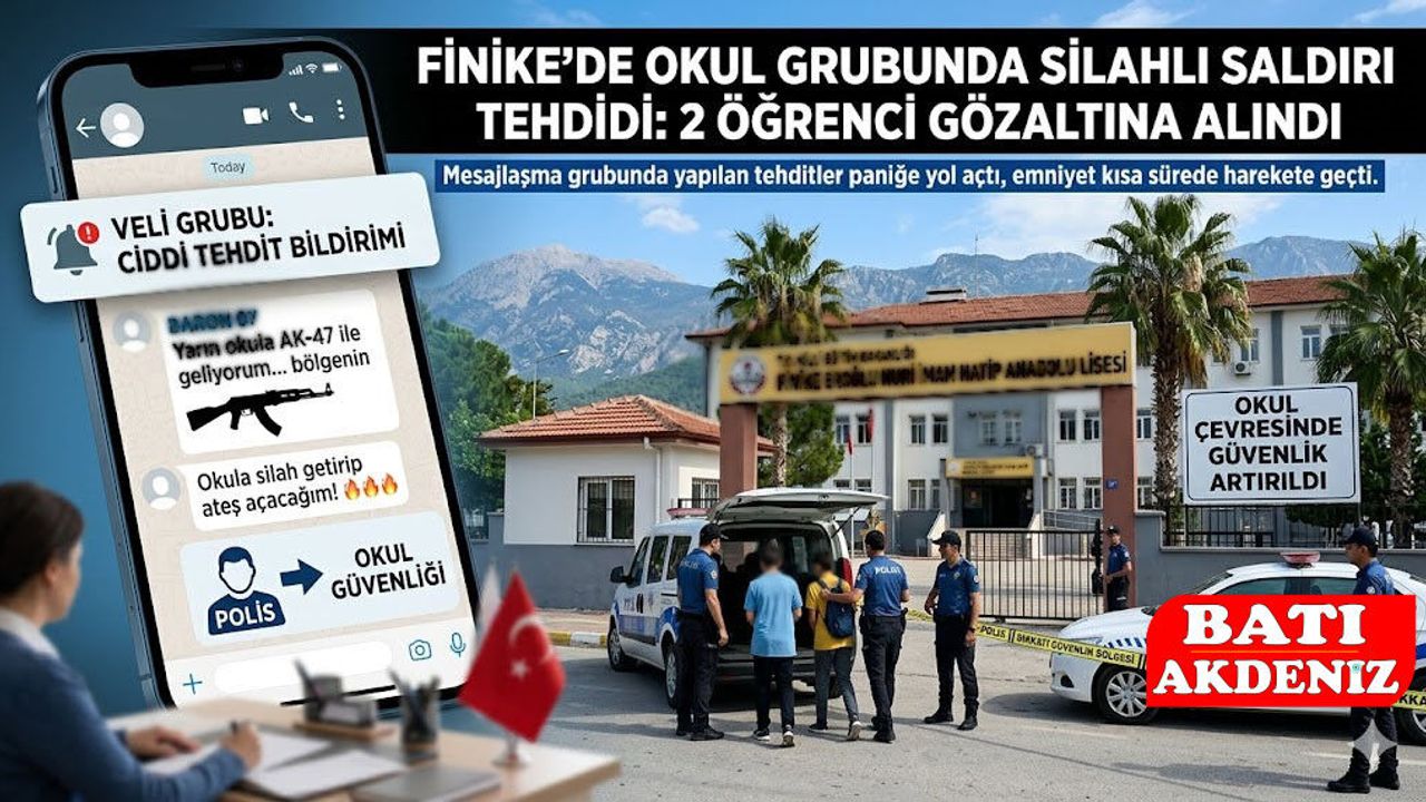 Antalya’nın Finike ilçesinde bulunan bir okula yönelik sosyal medya/mesajlaşma uygulaması üzerinden yapılan silahlı saldırı tehdidi, güvenlik güçlerini alarma geçirdi. Olayın, öğrenciler arasında kurulan bir ödev grubunda paylaşılan mesajlarla ortaya çıktığı öğrenildi.