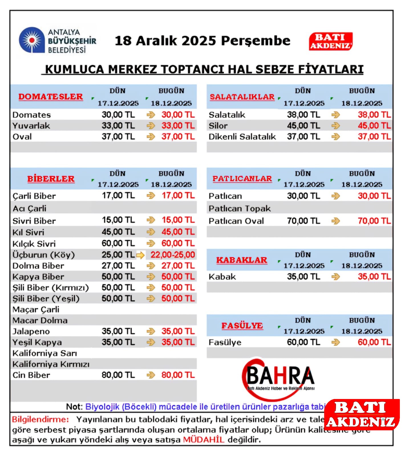 Antalya ve çevre ilçelerdeki hal verilerine göre oluşan en güncel sebze meyve fiyatlarını, foto galeri şeklinde inceleyebilir; ürün bazlı fiyatları tek tek görebilirsiniz.