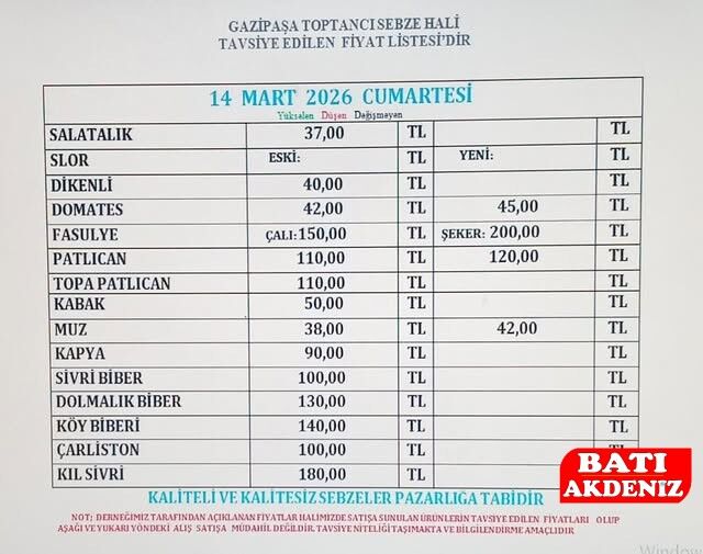 Gazipaşa halinde açıklanan fiyat listesine göre salatalık kilogramı 37 TL, silor salatalık 30-45 TL arasında işlem görürken, domates fiyatı 42-45 TL bandında oluştu. Biber grubunda ise kapya biber 90 TL, sivri biber 100 TL, dolmalık biber 130 TL, köy biberi 140 TL ve kıl sivri biber 180 TL ile yüksek fiyatlı ürünler arasında yer aldı.