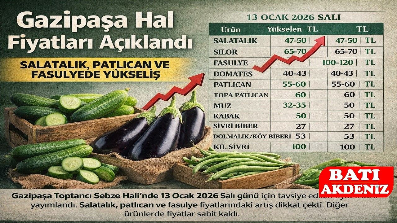 Gazipaşa Toptancı Sebze Hali’nde 13 Ocak 2026 Salı günü geçerli olmak üzere tavsiye edilen sebze ve meyve fiyatları kamuoyuyla paylaşıldı. Açıklanan listeye göre bazı ürünlerde artış yaşanırken, bazı kalemlerde fiyatların değişmediği görüldü.
