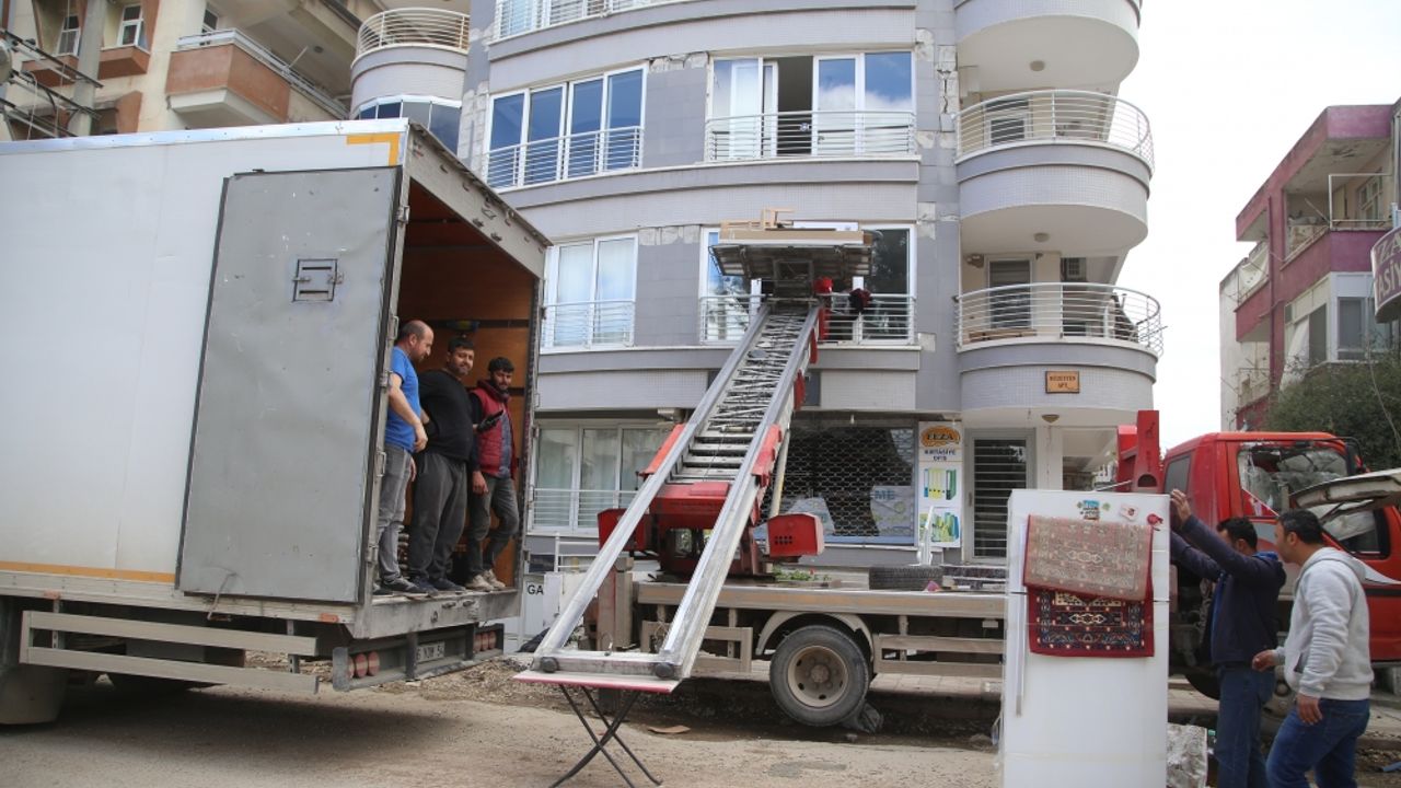 HATAY (AA) - Kahramanmaraş merkezli 6 Şubat'ta meydana gelen depremlerden etkilenen Hatay'da nakliyeciler, afetzedelerin hasarlı binalarından eşyalarını taşıyor.