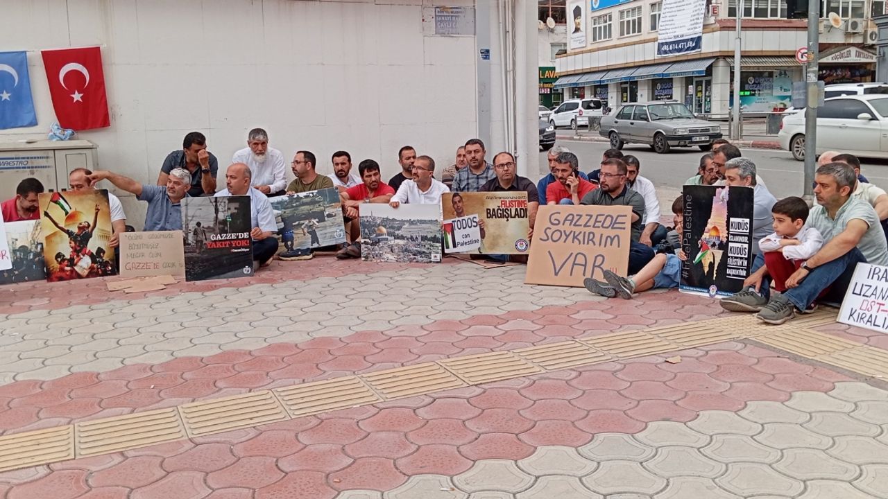 Sanayi Mahallesi'nde bir araya gelen bazı sivil toplum kuruluşlarının üyeleri, "Çocuklar ölürken sessiz kalınmaz", "Filistin'de zulme dur de" ve "Stop Israel" yazılı dövizler taşıdı.