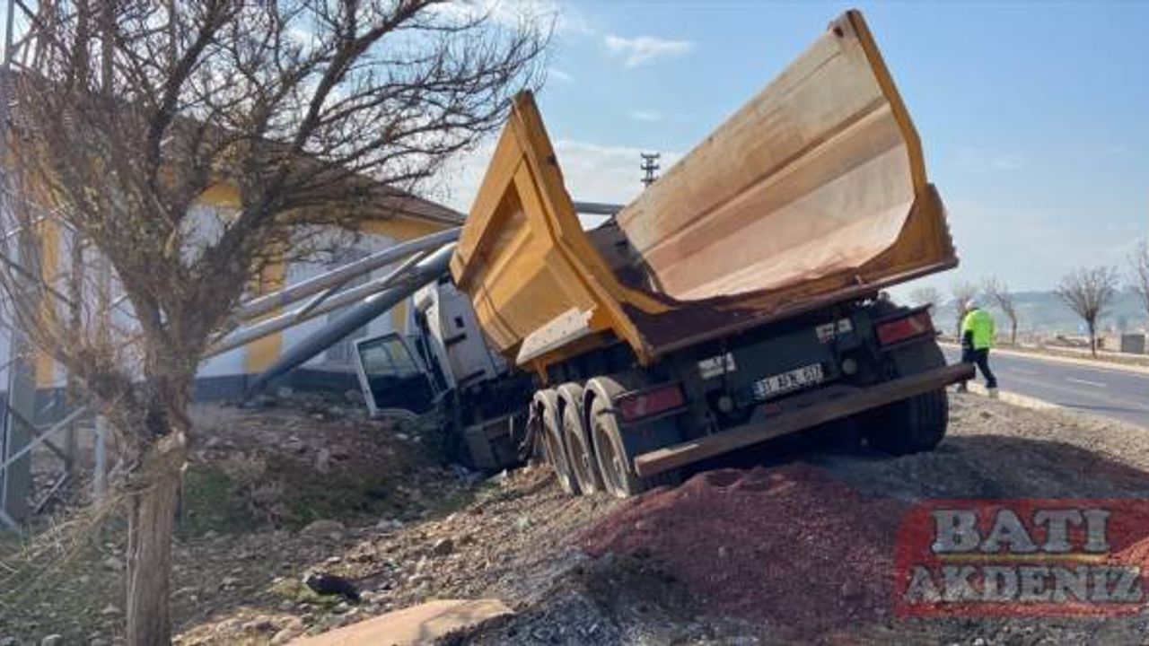 Cemal Samanlı yönetimindeki 31 AFN 617 plakalı hafriyat yüklü kamyon, Kırıkhan-Antakya yolunda sürücüsünün direksiyon hakimiyetini kaybetmesi sonucu yön tabelasına çarptı.