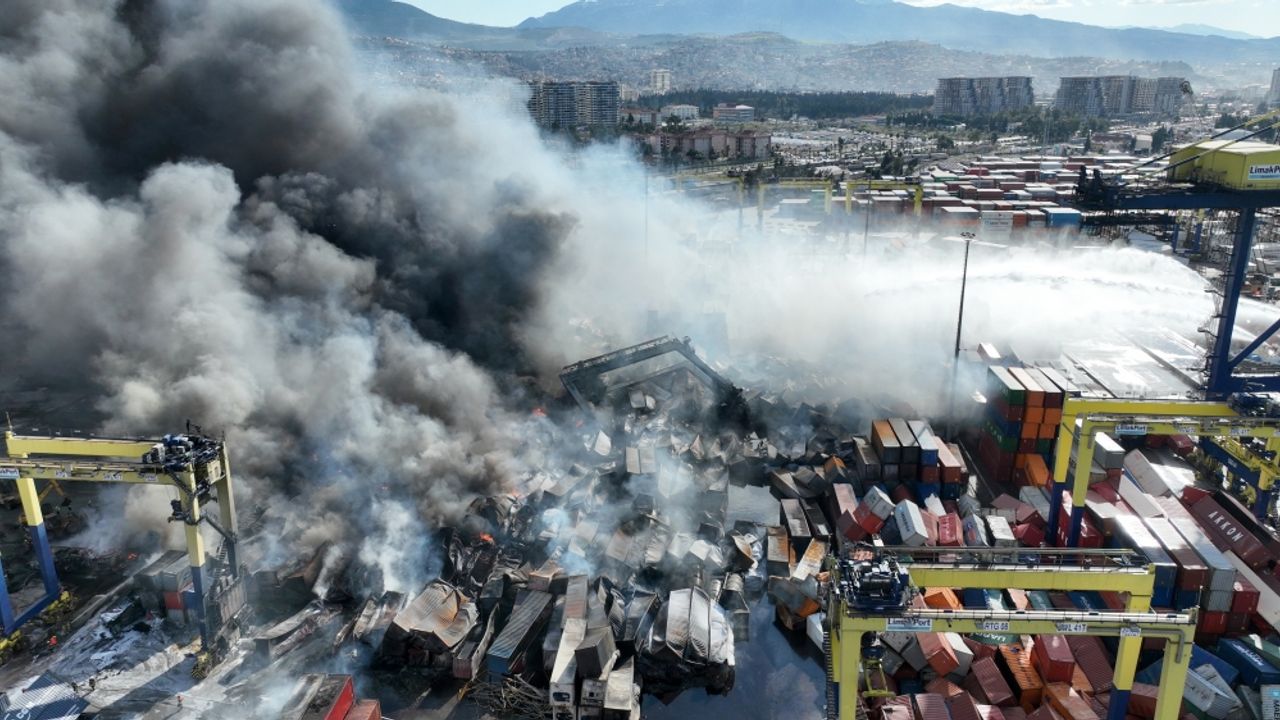 Liman sahasında, 6 Şubat'taki depremler sonrasında belirlenemeyen nedenle konteynerlerde çıkan yangın sürüyor.
