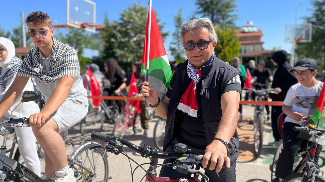 Okul bahçesinde vatandaşların da katılımıyla gerçekleşen etkinlikte yaklaşık 160 kişi, bisikletlerine Filistin ve Türk bayrakları astı.