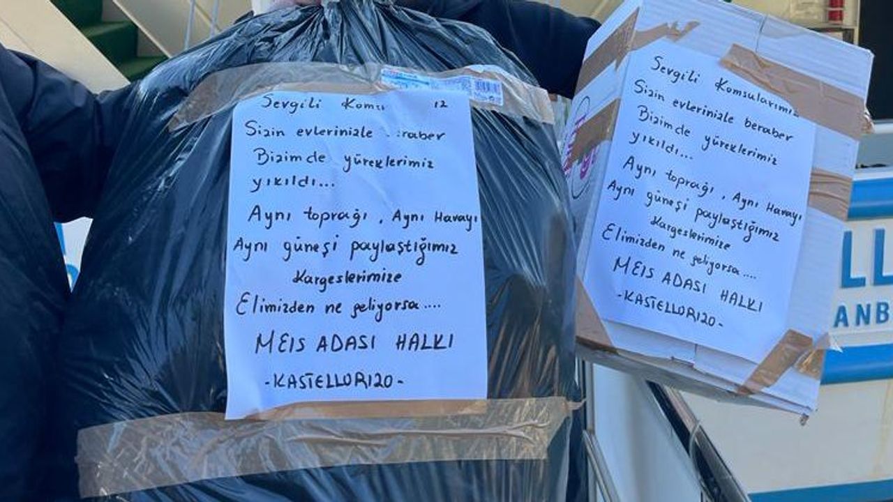 Yardım paketlerinin üzerinde Türkçe yazılmış, "Sevgili komşularımız. Sizin evlerinizle birlikte bizim de yüreklerimiz yıkıldı. Aynı toprağı, aynı havayı, aynı güneşi paylaştığımız kardeşlerimize elimizden ne geliyorsa… Meis Adası halkı-Kastellerizo" notu dikkati çekti.