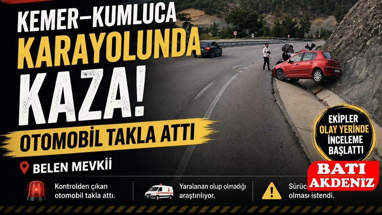 Antalya’nın Kemer ile Kumluca ilçelerini birbirine bağlayan karayolunun Belen mevkiinde trafik kazası meydana geldi. Edinilen bilgilere göre, seyir halindeki bir otomobil sürücüsünün direksiyon hakimiyetini kaybetmesi sonucu kontrolden çıkarak takla attı.