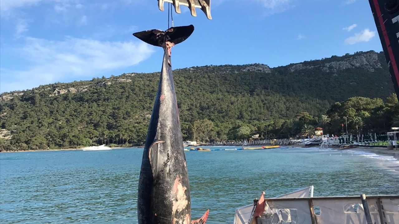 Bölgeye gelen Kemer Belediyesi Afet İşleri Müdürlüğü ekipleri, yapılan incelemenin ardından yunusu sahilden götürdü.
