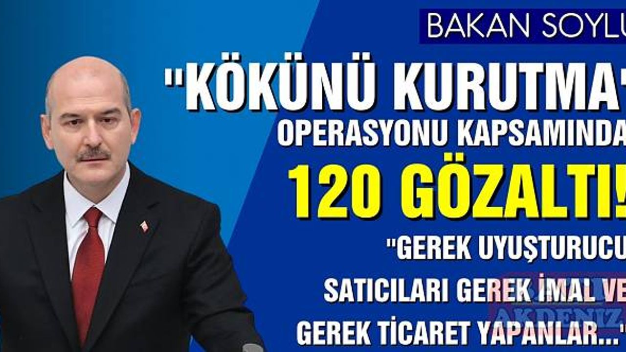 UŞAK (AA) - İçişleri Bakanı Süleyman Soylu, "Bu sabah 127 hedefe yönelik 33'üncüsünü gerçekleştirdiğimiz Kökünü Kurutma Operasyonu'nu başlattık. Şu saat itibarıyla 120 şüpheli gözaltına alındı. Gerek uyuşturucu satıcıları gerek imal ve gerek ticaret yapanlar..." dedi.