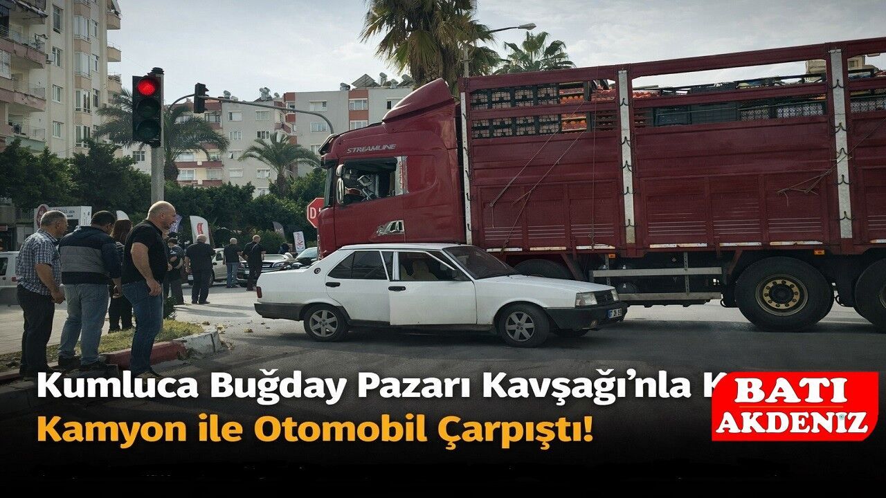 Antalya’nın Kumluca ilçesinde, şehir içi trafiğin yoğun noktalarından biri olan Buğday Pazarı Kavşağı’nda trafik kazası meydana geldi. Edinilen bilgilere göre, kavşakta seyir halinde olan bir kamyon ile otomobil çarpıştı.