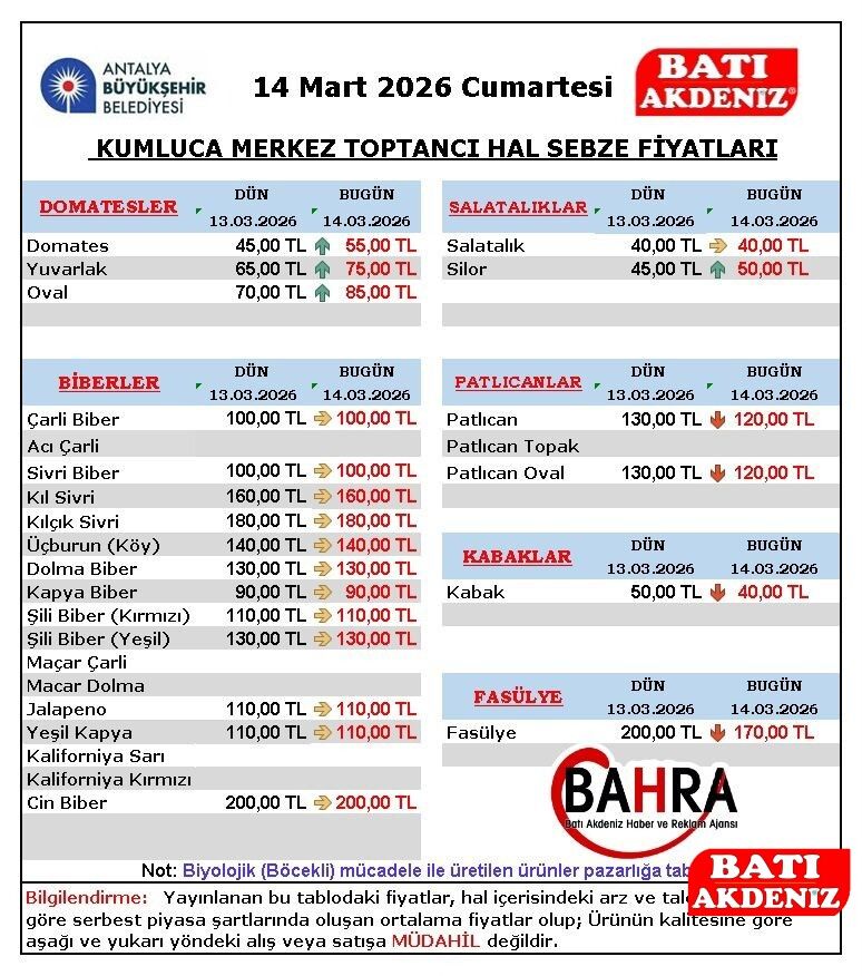 Antalya’nın seracılık merkezi olarak bilinen Kumluca ilçesinde 14 Mart 2026 Cumartesi günü Kumluca Merkez Toptancı Hali’nde oluşan sebze fiyatları açıklandı. Bölgedeki üretim miktarı, hava koşulları ve piyasa talebine bağlı olarak günlük değişen hal fiyatları, üreticiler ve pazarcılar tarafından yakından izleniyor.