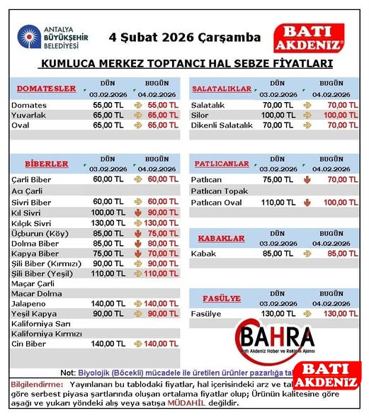 Hal piyasasında oluşan fiyatlar, hem üreticiler hem de tüketiciler açısından önem taşırken, önümüzdeki günlerde hava şartlarına bağlı olarak fiyatlarda dalgalanma yaşanabileceği ifade ediliyor. Kumluca hal fiyatları, bölge tarımının nabzını tutmaya devam ediyor.