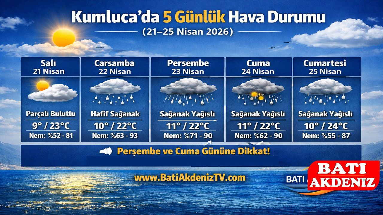 Meteoroloji verilerine göre Antalya’nın Kumluca ilçesinde 21 Nisan Salı günü parçalı bulutlu bir hava etkili olacak. Gün içinde sıcaklık 9–23 °C arasında değişirken, nem oranı %52–81 seviyelerinde seyredecek.