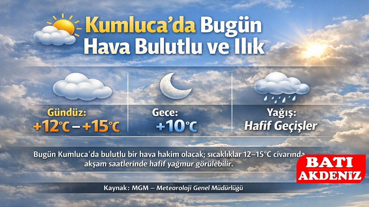 Antalya’nın Kumluca ilçesinde hava bugün genel olarak bulutlu ve ılık bir seyir izliyor. Meteoroloji verilerine göre gündüz sıcaklıkları yaklaşık 12–15°C, gece ise 10°C civarında tahmin ediliyor. Sabah saatlerinden itibaren bulutlu bir hava beklenirken, yağış ihtimali düşük ila orta düzeyde öngörülüyor.