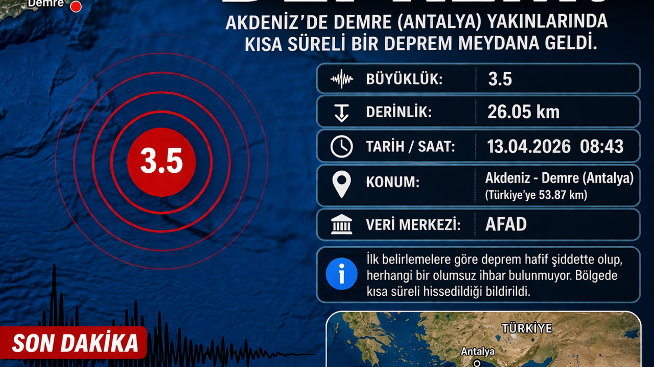Antalya’nın Demre ilçesi açıklarında sabah saatlerinde bir deprem meydana geldi. AFAD verilerine göre, Akdeniz açıklarında kaydedilen depremin büyüklüğü 4.7 olarak ölçüldü.