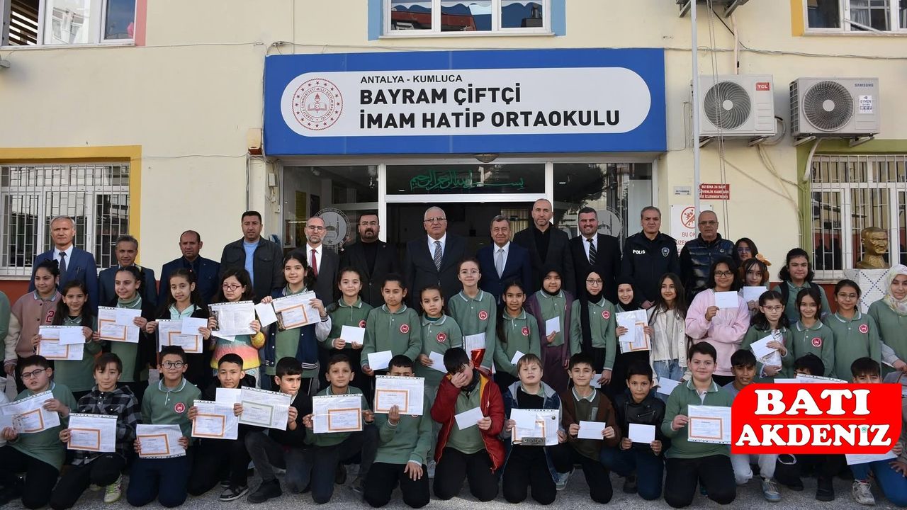 Antalya'nın Kumluca ilçesinde bugün karne heyecanı yaşandı. İlçe Kaymakamı Bahadır Güneş ve ilçe protokolünün katılımıyla Bayram Çiftçi İmam Hatip Ortaokulu’nda düzenlenen programda öğrencilerin karne sevinci yaşadı.